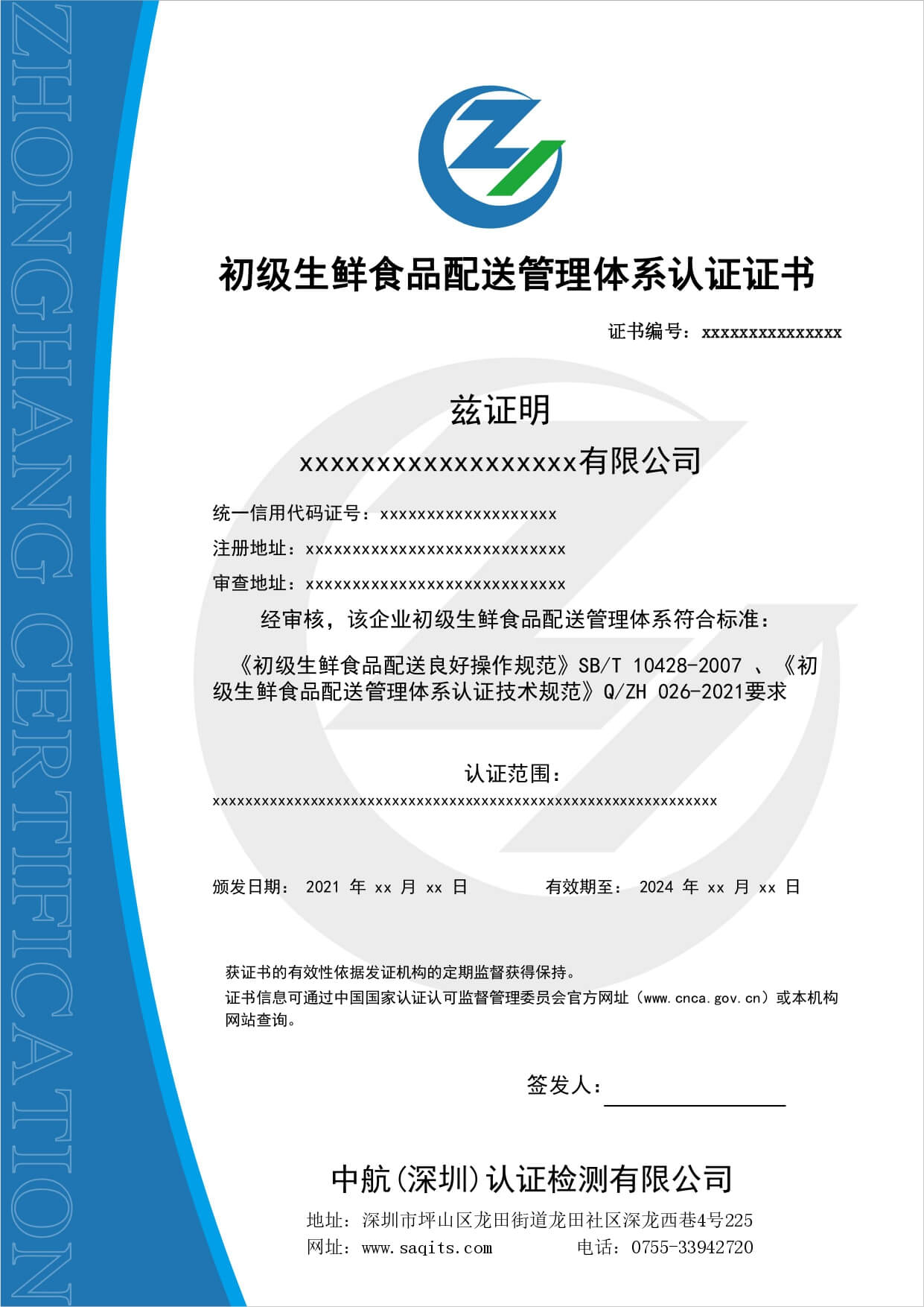 初級生鮮食品配送管理體系認證證書:1.保證向消費者提供新鮮、安全的多樣性生鮮食品;2.降低整個物流過程中的損耗,控制逆向物流的生成率,全面節省成本。...查看更多>>