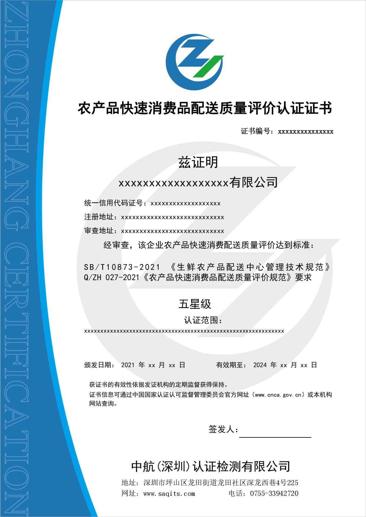 生鮮食品配送服務認證證書:1.保證生鮮食品以較短時間、較少流通環節進入消費環節;2.保證生鮮食品在流通中實現品質的穩定或提升; ...查看更多>>
